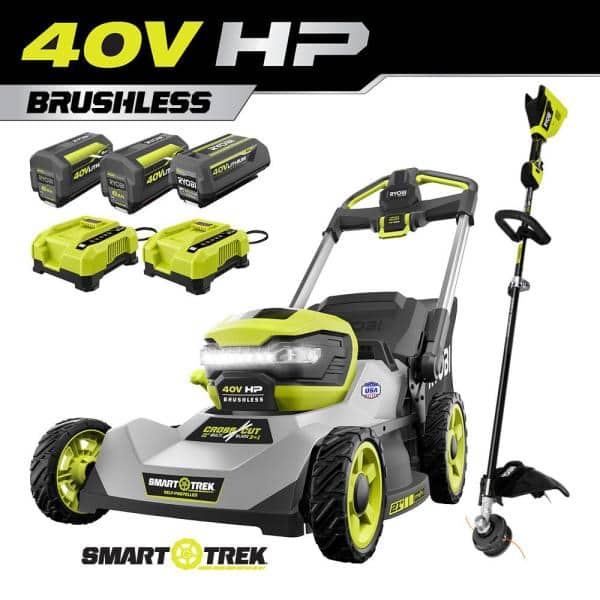 RYOBI redefines power and convenience with the 40V HP Cordless line. Premium HP brushless motors provide more power, longer runtime, and longer motor life. The self-propelled mower has SMART TREK technology to match the mower?s speed to your own pace. The mower cuts up to 3/4 acre or up to 70-minutes. The CROSS CUT Multi-Blade System offers 2 blades for superior cutting performance. The 21 in. deck is covered by a lifetime warranty. Use the 3-in-1 mowing functions to bag, mulch, or side discharge. 1-touch aluminum handles fold for vertical storage. The trimmer has a carbon fiber shaft for durability. The EXPAND-IT attachment capability turns the trimmer into many more tools using available attachments. The variable speed trigger and 2-speed switch deliver increased control. The 13 in. to 15 in. cutting width allows optimization. The mower, trimmer, (3) batteries, and (2) rapid chargers are all compatible with 75+ RYOBI 40V products. These tools are backed by a 5-Year Tool Warranty.