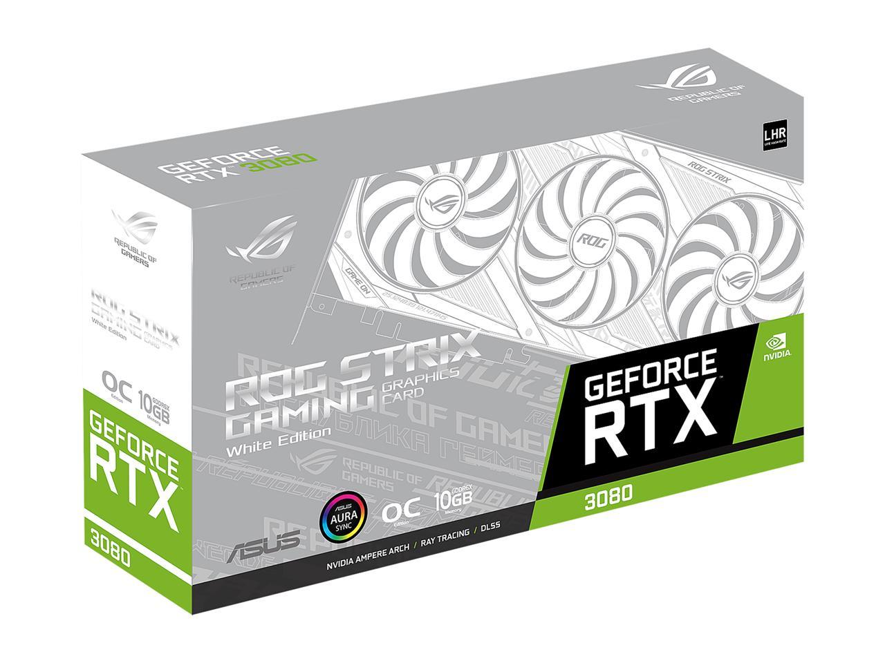 ASUS GeForce RTX 3080 Republic of Gamers Strix White Edition V2 OC LHR Graphics Card brings the power of real-time ray tracing and AI to your PC games. The GPU features 10GB of GDDR6X VRAM and a 320-bit memory interface, offering improved performance and power efficiency over the previous Turing-based generation. This graphics card is the LHR (Lite Hash Rate) version. The value of the Hash Rate may vary depending on your PC hardware specifications, quality of your internet connection, and/or other factors.