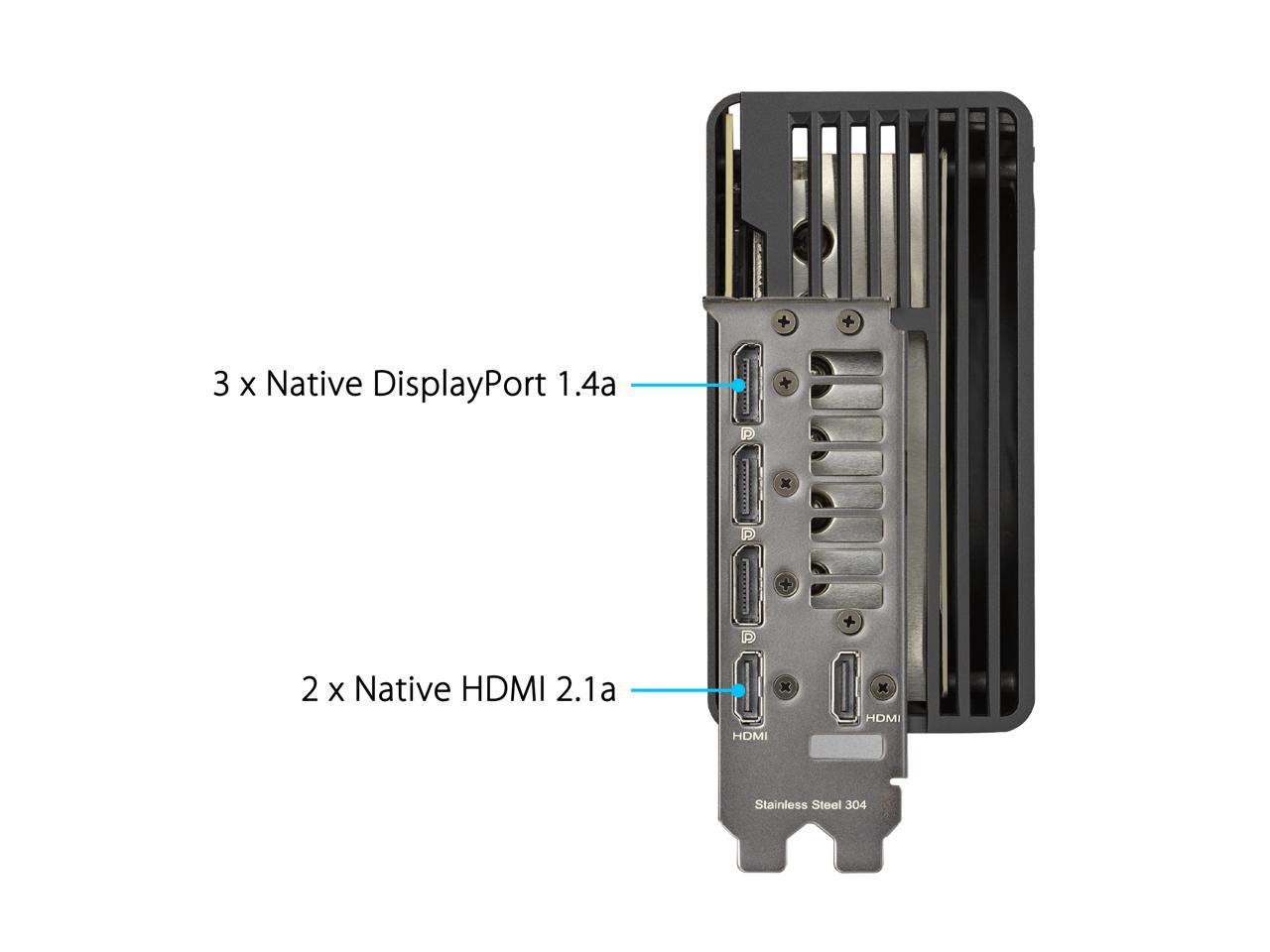 The front panel of the card features a variety of outputs, such as DisplayPort 1.4a and HDMI 2.1. HDMI 2.1 supports up to 48 Gb/s bandwidth and a range of higher resolutions and refresh rates, including 8K @ 60 fps, 4K @ 120 fps, and even up to 10K. The RTX 4090 is not just about high-resolution gaming. Computationally intensive programs can utilize the GPU’s 16384 cores to accelerate tasks using CUDA and other APIs. For cooling, ASUS implemented a triple Axial Tech fans for up to 23% more airflow. There is also ASUS Aura Sync RGB lighting support.