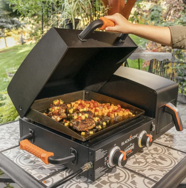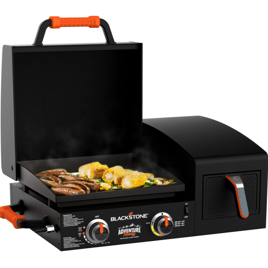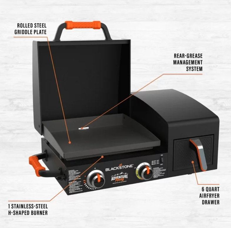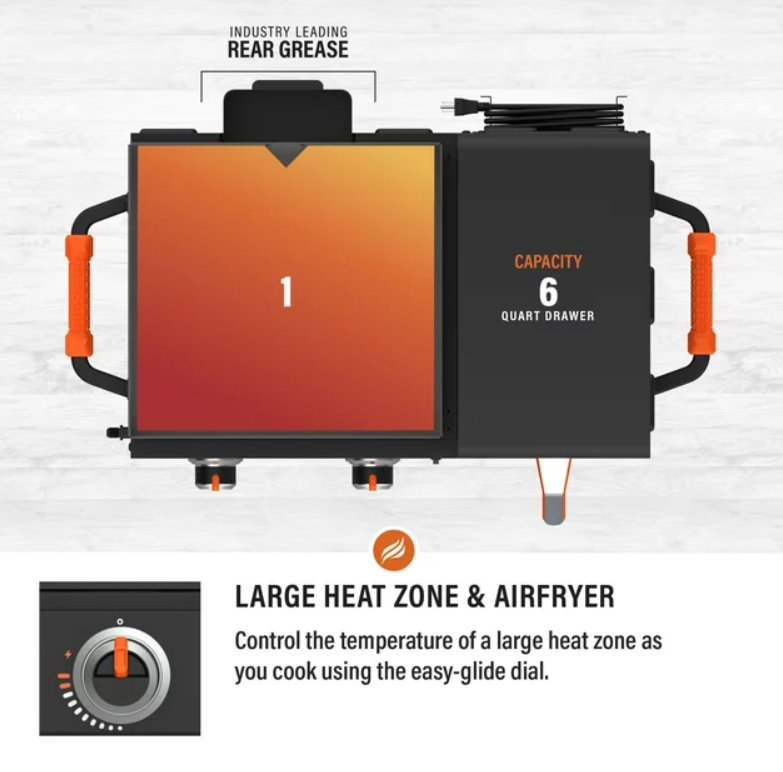 - Powered by 1-pound propane tank (griddle) and electric plug (air fryer)