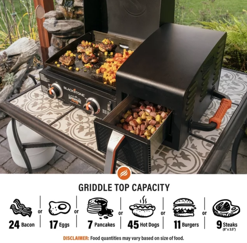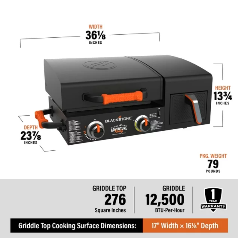 If you’ve always wanted to take your air fryer to the great outdoors, now you can! Consider the game changed. Introducing the Blackstone Adventure Ready 17-Inch Griddle Air Fryer Combo. The rough and tough Adventure Ready Griddle with Air Fryer will surely impress your friends and family wherever you are. The Griddle and Air Fryer make the perfect combination for breakfast, lunch, and dinner. Throw in some hash browns while you cook pancakes, or some French Fries while you make the perfect smash burger. With this amazing duo, the possibilities are endless. And if you find yourself cooking more than you thought, this great combo includes a 20 lb. propane adapter hose.