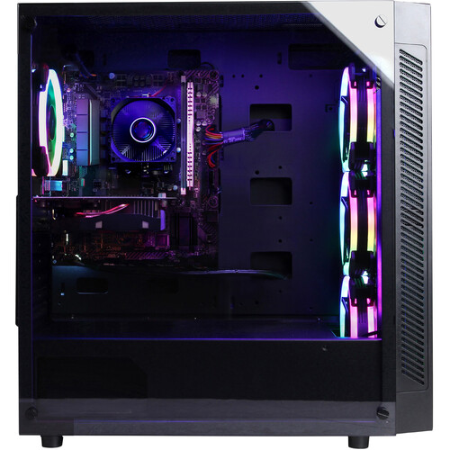 This system is built within a CyberPowerPC Deepcool Matrexx 55 black mid-tower case and has a 600-watt power supply. Additionally, the case features a tempered-glass side panel and custom RGB lighting.