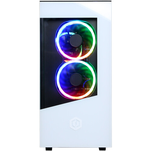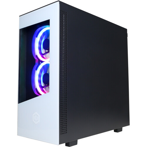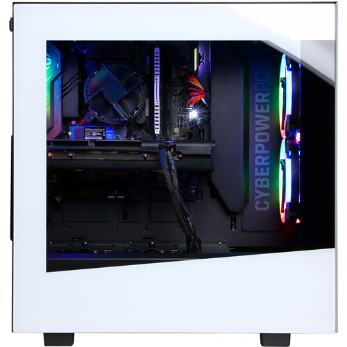 This system is built within a CyberPowerPC Onyxia III white mid-tower gaming case and has an 800-watt power supply. Additionally, it features a tempered-glass side panel and custom RGB lighting.