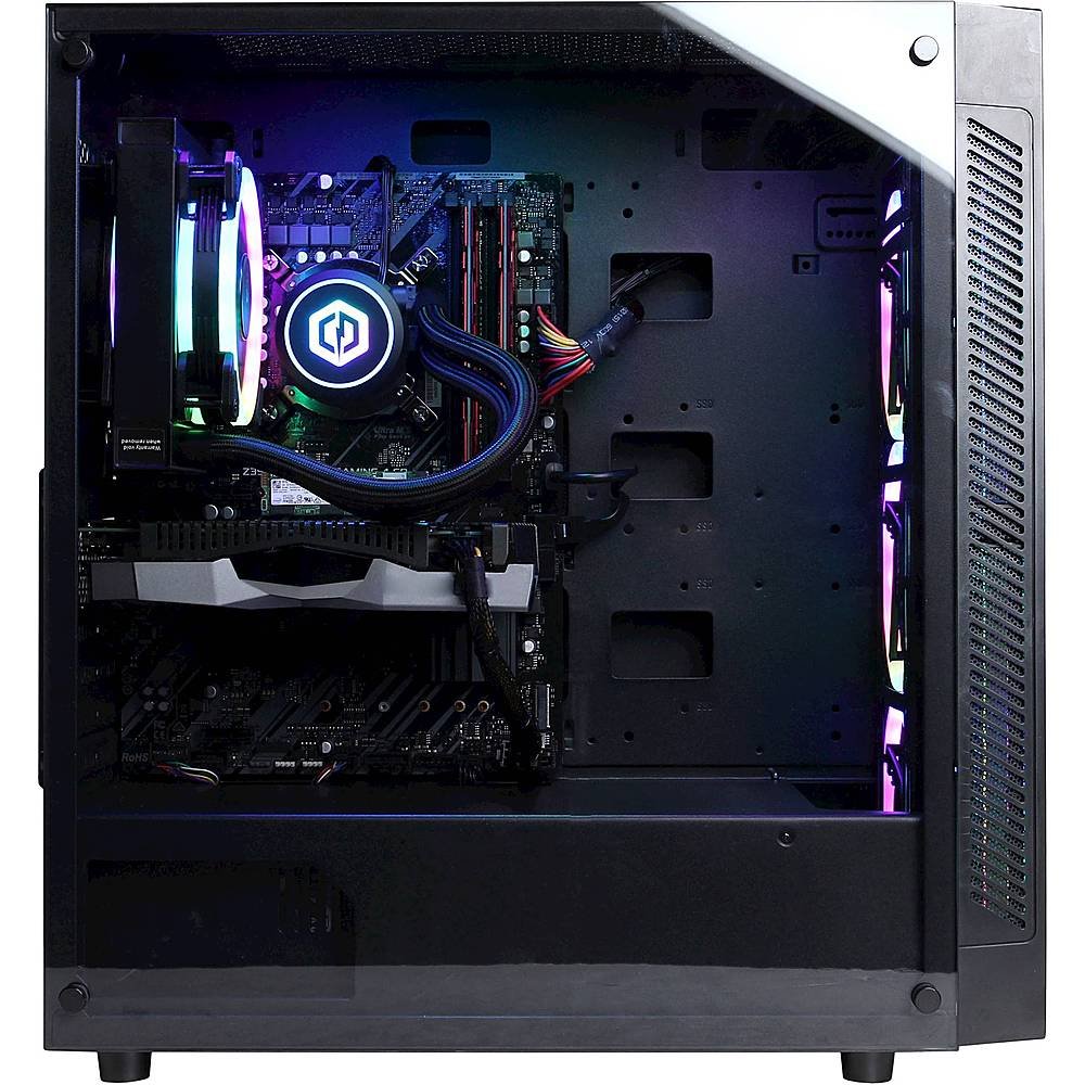 This system is built within a Deepcool Matrexx 55 black mid-tower case and has an 800-watt power supply. Moreover, it features a tempered-glass side panel and custom RGB lighting. The preinstalled closed-loop liquid cooler keeps your CPU cool while under load.