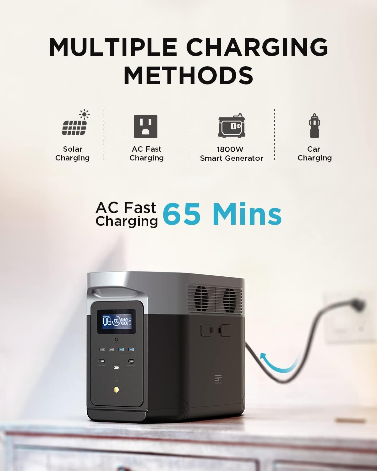 - 1.8 Hrs to Full Charge. EcoFlow’s patented X-Stream AC fast charging lets you recharge DELTA Max in only 1.8 hours. Or even quicker if you combine any two charging methods, that’s from an AC wall outlet, solar panels, or a Dual Fuel Generator.