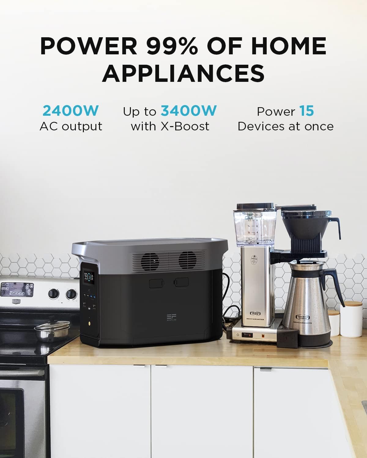 - Power Heavy-duty Devices with 2400W Output. 2400W output to power up to 15 devices at once. Power 3400W appliances with X-Boost on. That means during a power outage or blackout, you can continue to power your fridge, microwave, dryer, and more. Ideal power generator for backup power.