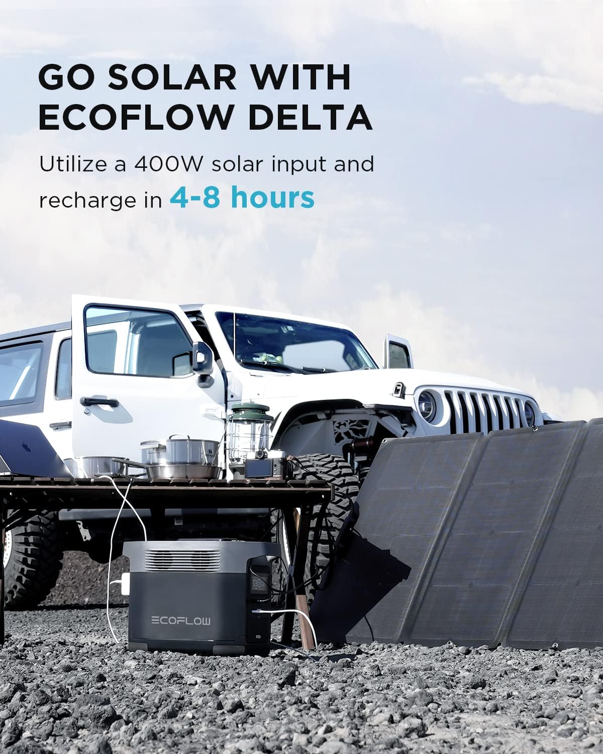 - Solar Charging, Car Charging & More. DELTA is equipped with a lithium battery pack, it can be charged by the 10-65V solar panel (not included), AC wall adapter and car charger efficiently. Charge to full in as fast as 4 hours with EcoFlow solar panels.