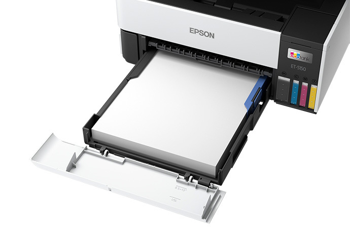A 250-sheet input tray works with documents up to 8.5 x 14″, and for scanning and copying, the unit has an 8.5 x 11.7″ flatbed scanner and ADF. Optical scan resolution is an impressive 1200 dpi. Settings can be checked and quickly changed via the 2.4″ color touchscreen, and for maximum versatility during setup, the ET-5150 is equipped with USB 2.0, Ethernet, and Wi-Fi connectivity. Additionally, mobile printing is made possible via Apple AirPrint, Mopria, Epson Email Print, and the Epson iPrint Mobile App.