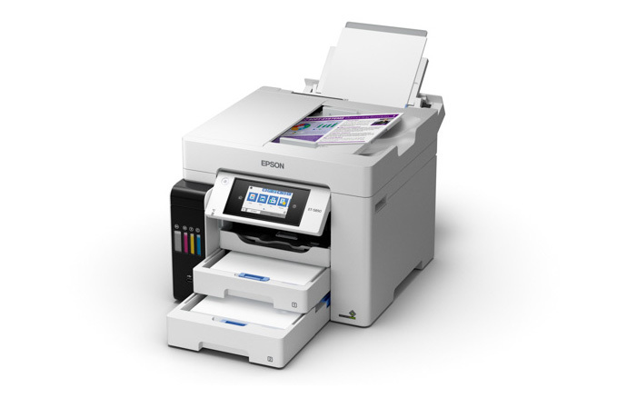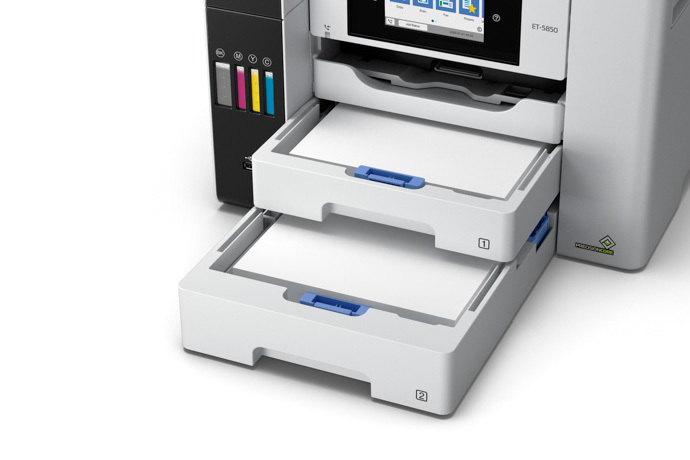 Two 250-sheet input trays work with documents up to 8.5 x 14″, and a long-document mode on the rear feed enables the production of media up to 8.5 x 47.2″. For scanning and copying, the unit has an 8.5 x 11.7″ flatbed scanner that allows scans up to 8.5 x 14″ with the ADF, and optical scan resolution is an impressive 1200 dpi. Settings can be checked and quickly changed via the 4.3″ color touchscreen, and for maximum versatility during setup, the ET-5850 is equipped with USB 2.0, Ethernet, and Wi-Fi connectivity. Additionally, mobile printing is made possible via Apple AirPrint, Mopria, Epson Connect Email Print, and the Epson iPrint Mobile App.