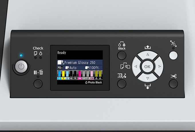 Operation is simple with a top-loading feed for both rolls and cut-sheet media. There is also a built-in rotary cutter for automatically cutting prints from rolls and the front control panel has a 2.7″ color LCD screen for checking print status and settings. And, it has both USB 2.0 and Ethernet connectivity for setting up the unit as you need it.