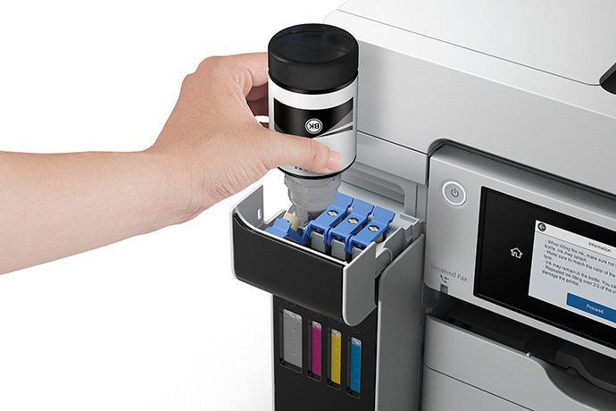 - Ink bottles feature auto-stop technology and unique keys for easy filling