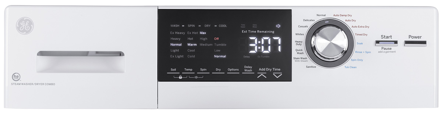 To get started, choose a wash cycle with the intuitive control dial. This GE front load washer/condenser dryer unit has 14 cycles to accommodate a variety of washing needs. If you’re in a rush, for example, you may want Quick Wash, or if you work outside or in the medical field, you may want to use the Sanitize cycle. You can also choose from five soil levels, five wash temperatures and five spin speeds. With so much customization, you can tailor each cycle to the exact items within, whether it’s bulky sweaters, delicate blouses or bedding. With Auto Wash + Dry, you can simply set it and forget it: this feature automatically sets the correct dry cycle based on the wash cycle so you can make your choice and go to work or run errands.