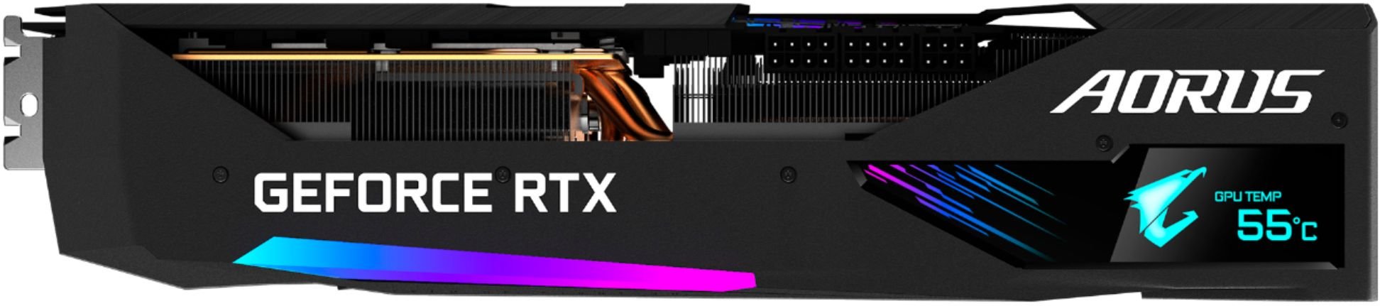 For cooling, Gigabyte implemented MAX-COVERED cooling, which features triple 100mm unique blade stack fans with a wind claw design. The fans also feature alternate spinning so air pressure can completely cover the heatsink. The card also features a LCD Edge View that displays graphics card information and can be customized to show various texts, pictures, and even GIFs. You can also adjust lighting effects via RGB FUSION 2.0 software.