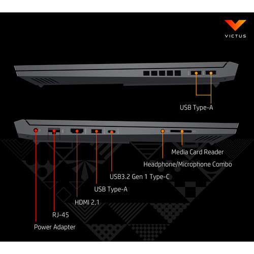 For storage of your files, there is a 512GB NVMe PCIe M.2 SSD. If you’d like to connect external storage or devices such as optical drives, media card readers, printers, or scanners, the Victus 16-d1010nr has one 5 Gb/s USB 3.2 Gen 1 Type-C port that supports Power Delivery, DisplayPort 1.4, and HP Sleep and Charge. There are also three 5 Gb/s USB 3.2 Gen 1 Type-A ports, one of which supports Sleep and Charge, plus one HDMI 2.1 port for external displays. Connect to the internet via Gigabit Ethernet or Wi-Fi 6E (802.11ax), and pair compatible wireless peripherals with Bluetooth 5.2 technology to free up USB ports for more important devices. Other integrated features include an SD/SDHC/SDXC card reader, a user-facing 720p webcam, dual speakers, and dual-array mics.