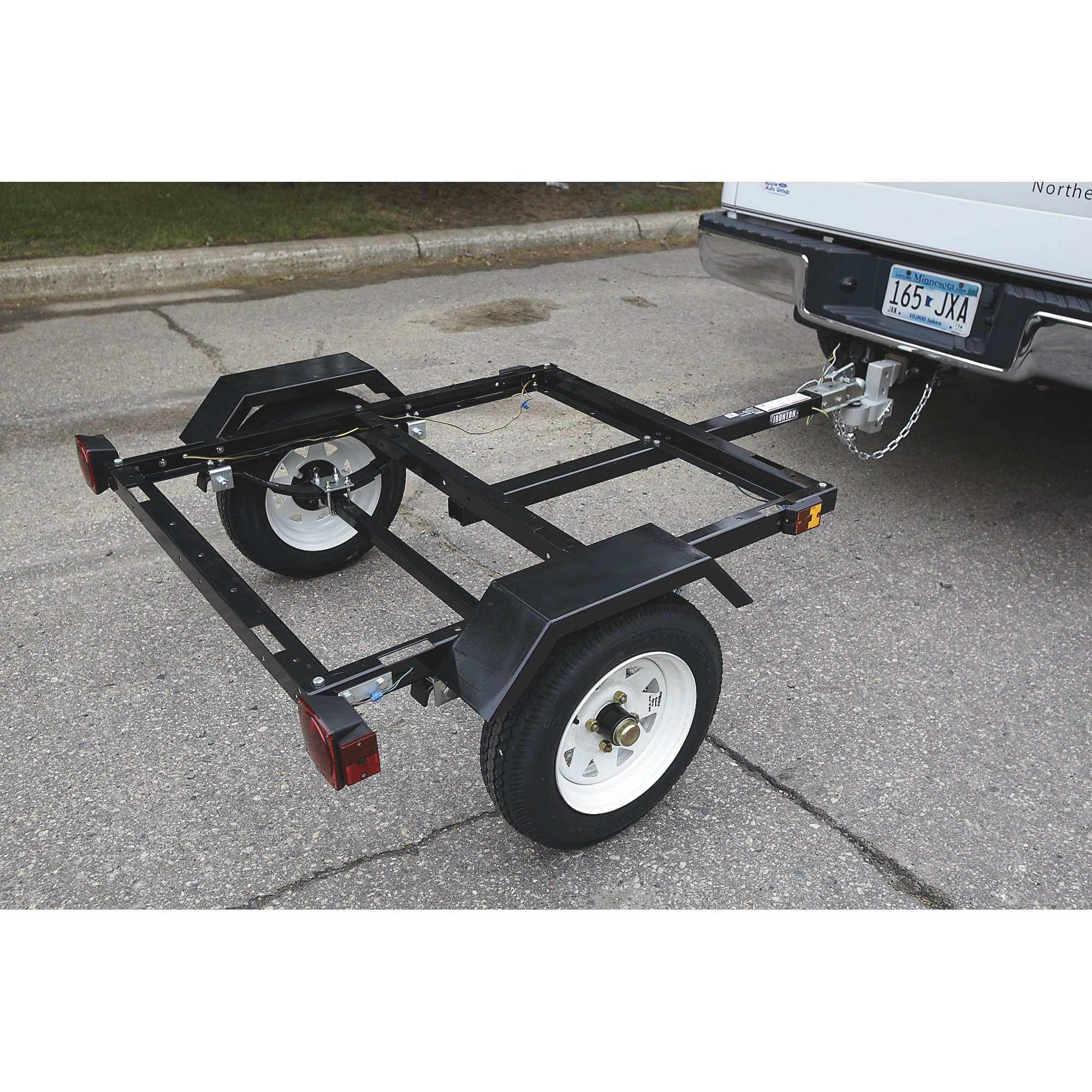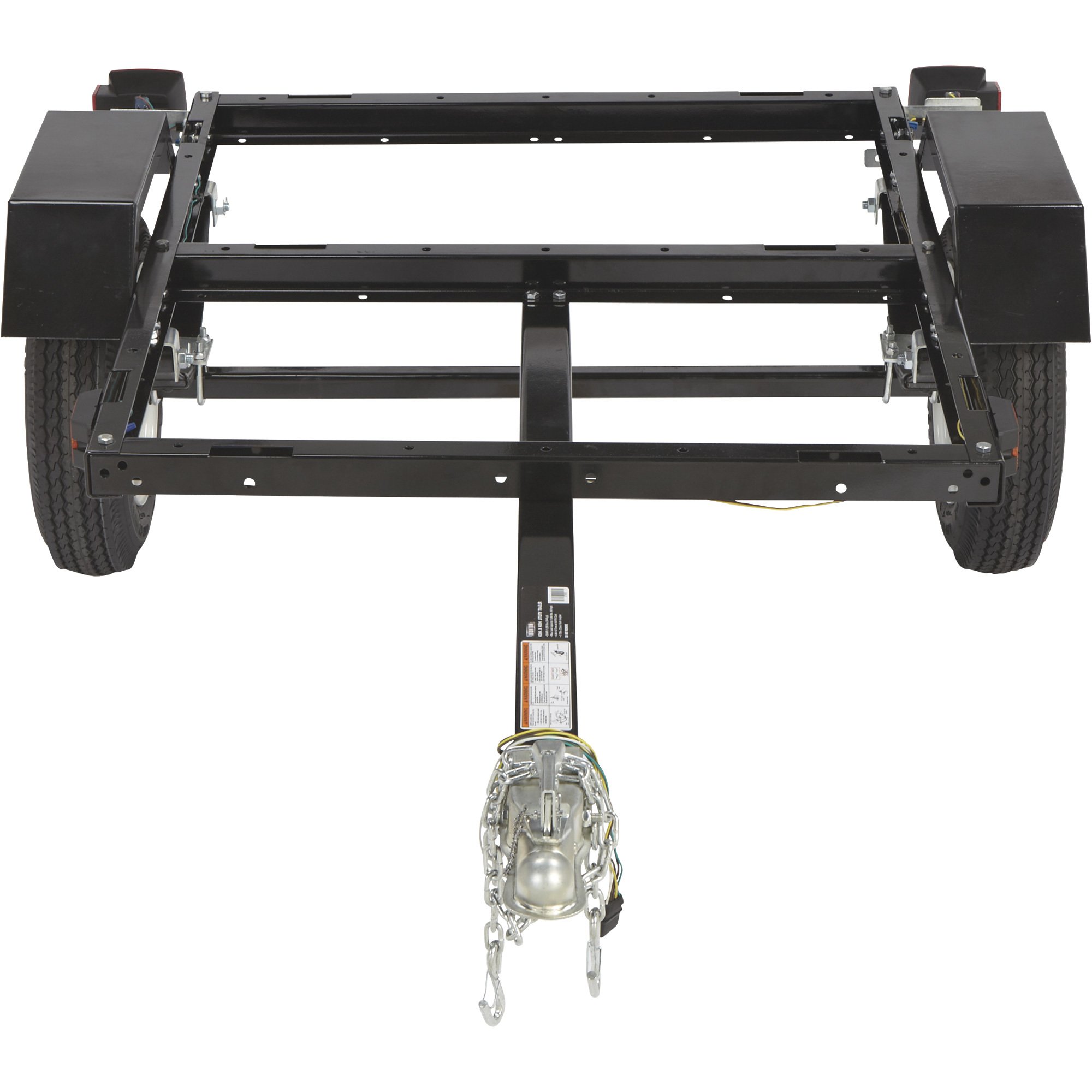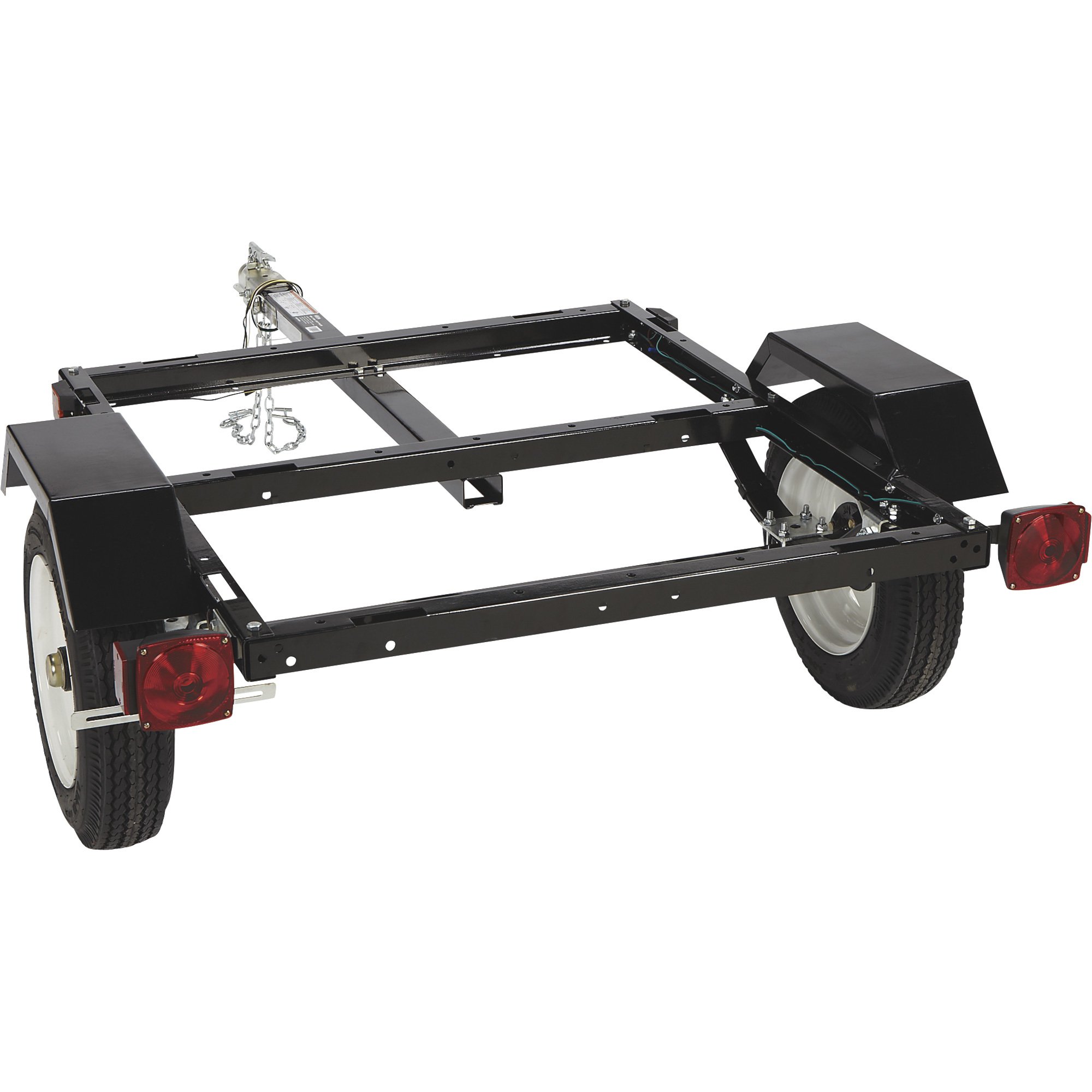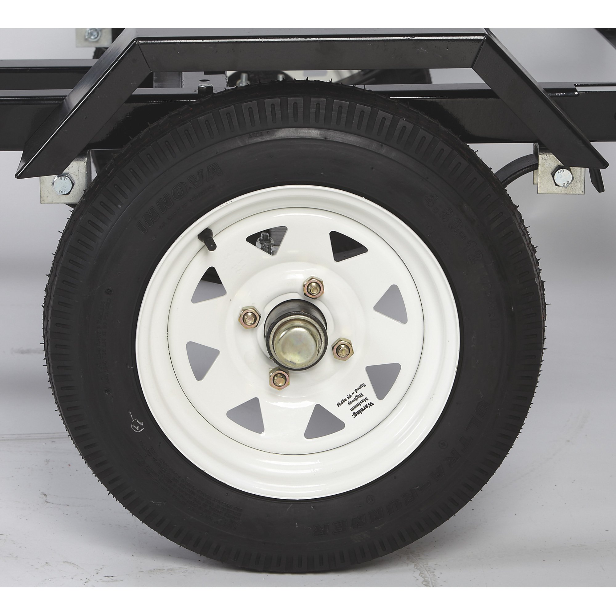 Take a rugged steel frame, and then top it off with a pair of 4.80–12in. tires with protective fenders to prevent rocks and debris from damaging your cargo. Built-in slots allow you to place your own side panels or stake siding to keep the load contained. Add your own decking (not included) to create a customized hauler.