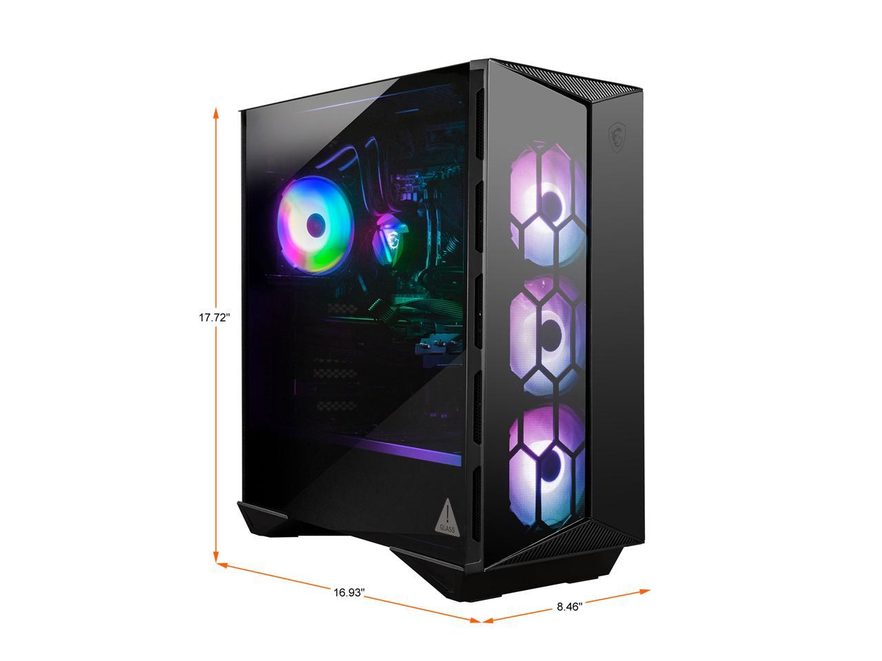 The CPU temperatures are kept down with the 120mm Liquid CPU Cooler. Play online multiplayer matches via the 2.5 GbE Ethernet RJ45 LAN jack or go wirelessly via Wi-Fi 6 (802.11ax). An MSI gaming keyboard and mouse are included. Windows 11 Home is the installed operating system.