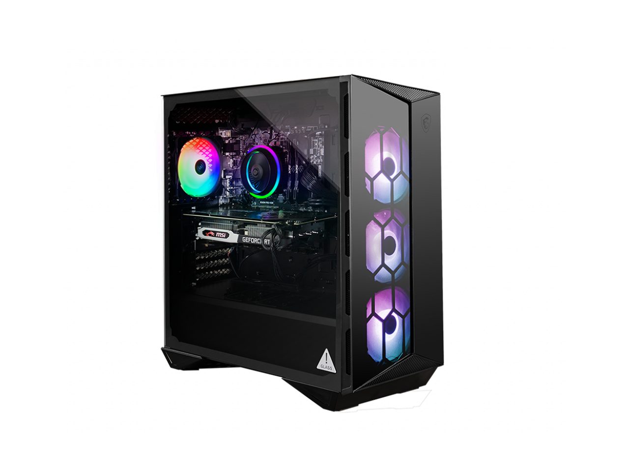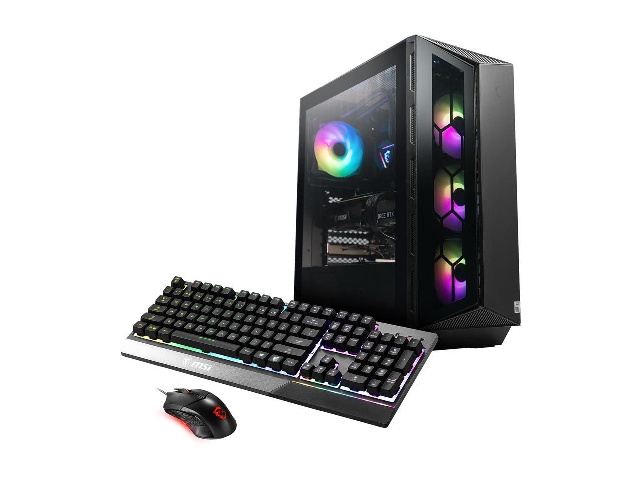 MSI Aegis ZS Gaming Desktop Computer. With built-in RGB lighting, you can customize how your gaming setup looks. Simply press the MSI LED button to cycle through a variety of lighting options. Powered by a 3.8 GHz AMD Ryzen 7 5700G 8-Core processor and 16GB of DDR4 RAM, the MSI Aegis ZS is more than capable of running your favorite games with ease. The 500GB M.2 NVMe SSD allows for fast boot and load times. The NVIDIA GeForce RTX 3050 graphics card with 8GB of GDDR6 VRAM can handle your favorite PC games with ease, providing HDMI and DisplayPort outputs.
