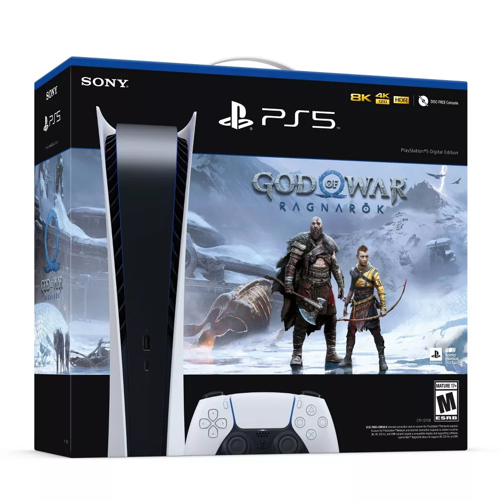 PlayStation 5 Digital Edition Console – God of War Ragnarök Bundle includes: PlayStation 5 Digital Edition console, DualSense wireless controller, Base, HDMI cable, AC power cord, USB cable, Printed materials, ASTRO’s PLAYROOM (Pre-installed game. PS5™ console may need to be updated to the latest system software version. Internet connection required.), God of War Ragnarök full game voucher.