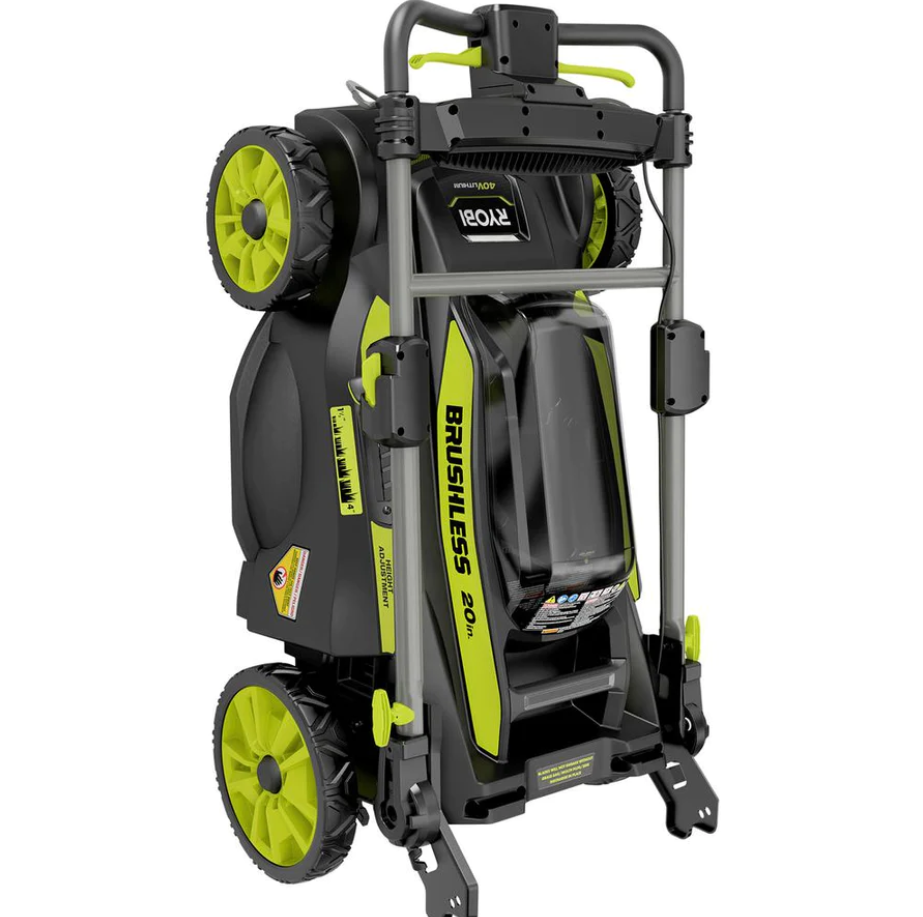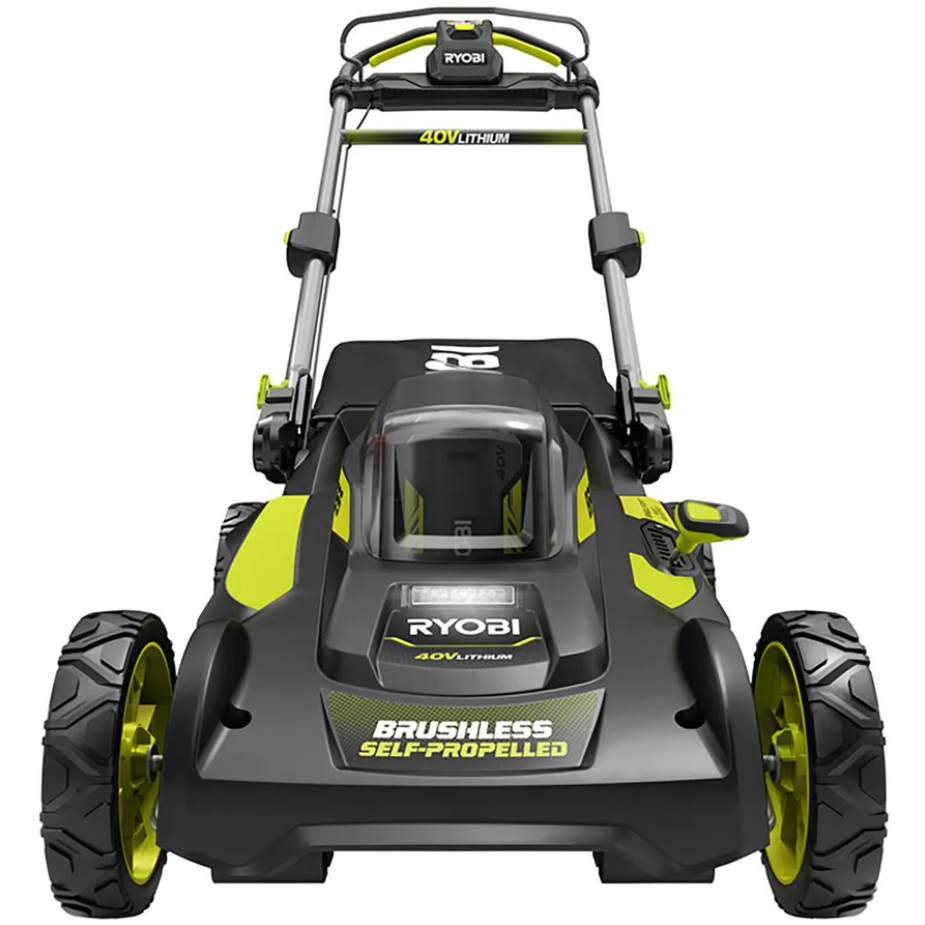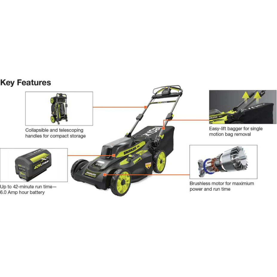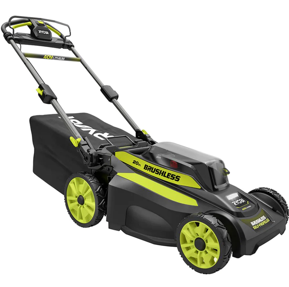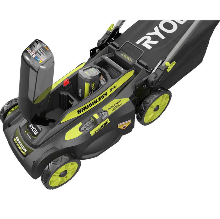 RYOBI continues to lead the industry in cordless mower innovation with their second generation 40-Volt 20 in. Brushless Self-Propelled Mower. Combining 40-Volt Lithium-Ion Battery power with Brushless Technology this mower delivers gas-like power, without the hassle of gas, oil or maintenance. The high capacity 6 Ah battery provides extended run-time and instant power at the push of a button. Choose between bagging or mulching your grass, to get your desired results or purchase the side discharge accessory online (model, AC040VSD01) for 3-in-1 mulching, bagging and side discharge capability. Select your ideal grass height with the 7-position single point height adjustment. If you prefer mowing in the cooler evening hours, high-intensity LED headlights provide the perfect solution. When the job is done simply remove the Easy-Lift single motion lock and release bagger to empty your grass and lock it back in place. With collapsible telescoping handles, this mower easily folds down when the job is done and can be stored vertically making it ideal for compact spaces.