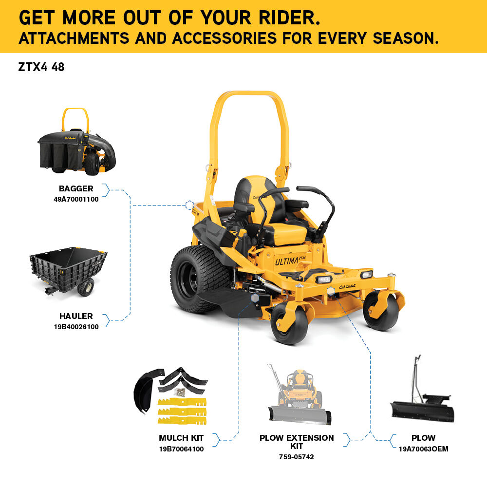 - Expand your mower’s capabilities: full lineup of premium attachments and accessories include baggers, mulch kits, carts and many other attachments (sold separately)