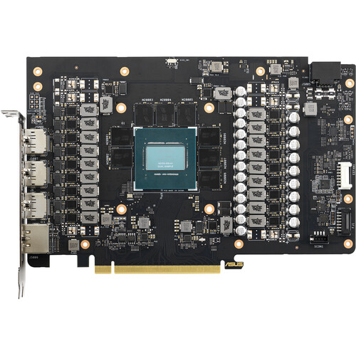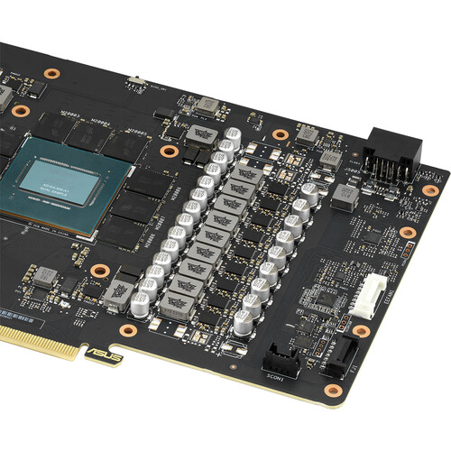 For cooling, ASUS implemented triple Axial-tech fans, providing improved airflow and dispersion. There is also Aura Sync RGB lighting on the shroud and backplate. Using Aura Sync software, you can sync the RGB lights with other ASUS products for a customized gaming setup. With Aura Sync, you can sync to music, temperature-based color changing, or select from a variety of patterns and static options.