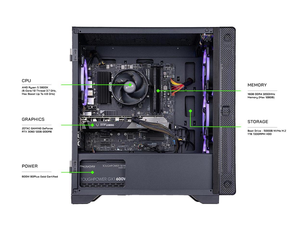 Equipped with a 3.8 GHz AMD Ryzen 7 Series 8-core processor, 16GB of 3200 MHz DDR4 RAM, and an NVIDIA GeForce RTX 3070 graphics card, the A5837 is ready to take on your opponents while delivering robust and immersive visuals. Store fast-launching apps on the 1TB M.2 NVMe SSD and copious amounts of media on the 1TB HDD.
